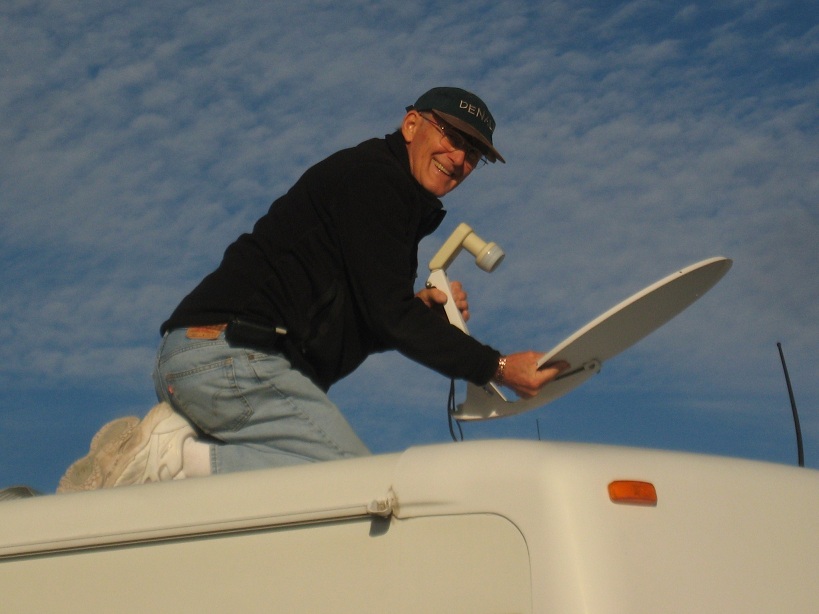 Back to today, when I tried to tune in the satellite dish, I raised it, but was unable to rotate it to face south. How could we have both forgotten to test that? Hence, Ron back on the roof. Soon he had it working perfectly. Of course my solution was that we could just always park facing north. Then the dish would be facing the right way. Hey, what's wrong with that?